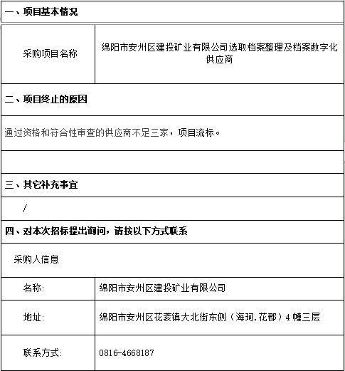 綿陽安州礦產(chǎn)資源集團有限公司選取檔案整理及檔案數(shù)字化供應商流標公告